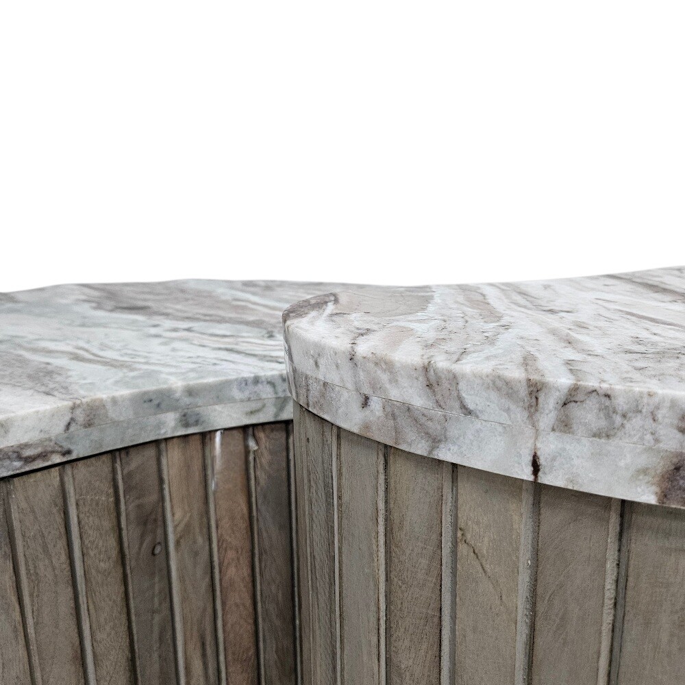 Meticulously handcrafted, this set of two tables features a stunning combination of premium white marble tops and sustainably sourced solid mango wood bases. The larger table showcases a cool, veined marble surface that radiates elegance, while the smaller nesting table offers a warm, multi-tonal wood top, creating a balanced, artisanal aesthetic